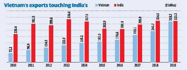 Vietnam's total merchandise exports grew at an average annual rate of 18% over the past 10 years through 2019, while India's only 5%. While Vietnam started to trade surplus, India's trade deficit increased to 156 billion USD in 2019.
